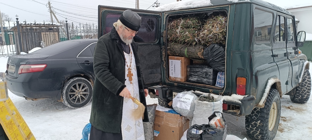 Перед освящением гуманитарной помощи протоиерей о. Алексей Гущин совместно с клириком храма иеромонахом о.Сергием Андруховским на Праздничной литургии в честь памяти Преподобного Серафима Саровского была вознесена молитва о Святой Руси и молитва о путешествующих в доставке гуманитарной помощи в зону СВО, о здравии и благоденствии всех волонтёров и прихожан, которые принимают участие в организации, изготовлении, сбору гуманитарной помощи.