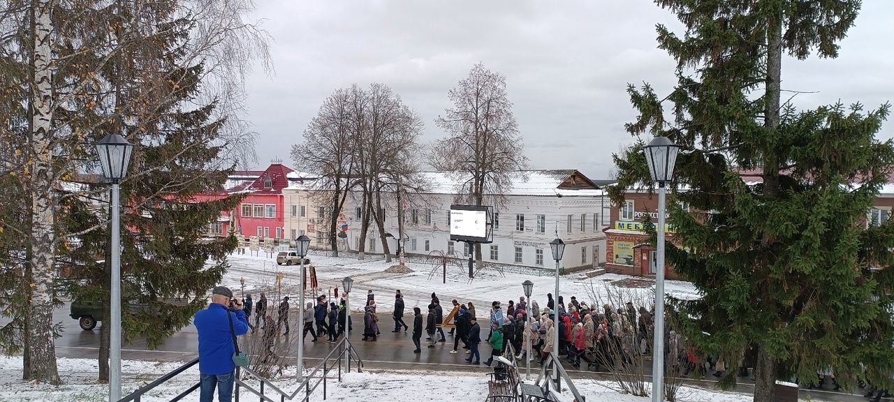 Сегодня, 4 ноября, в Краснобаковском муниципальном округе проводился крестный ход. Проходил он следующим образом: ряды верующих во главе со служителями церкви шествуют от Никольского храма по главным улицам районного поселка Красные Баки и завершается в Никольском храме.