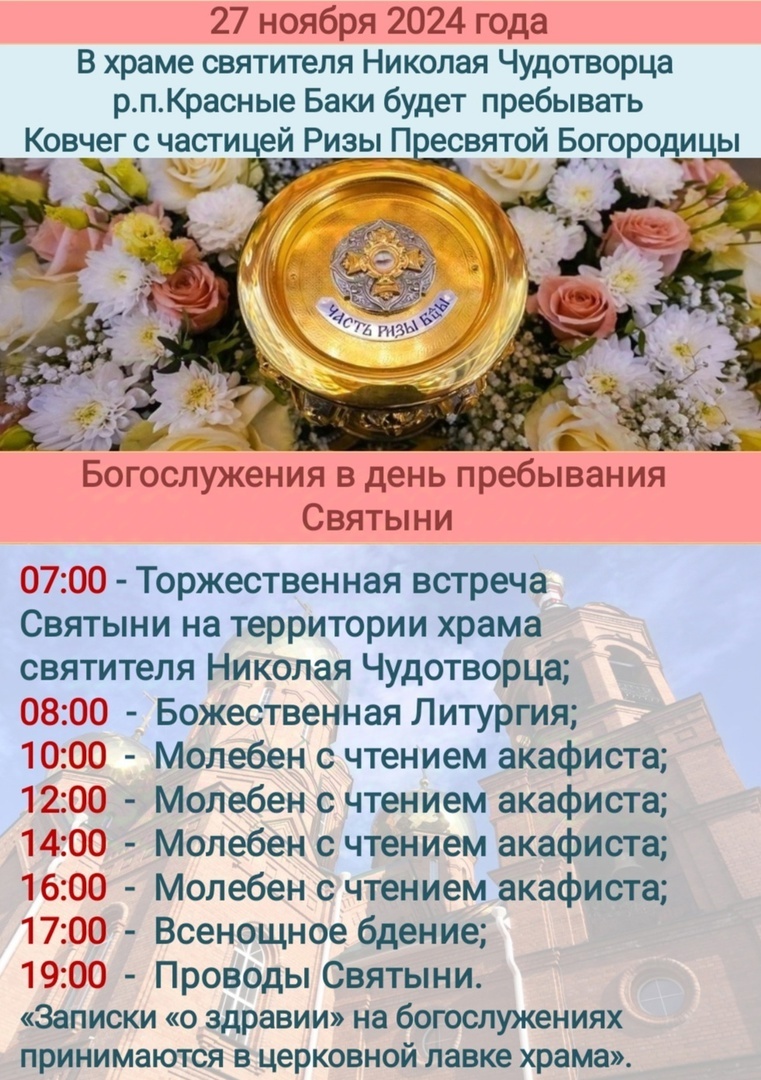 27 ноября 2024 года в храм святителя Николая Чудотворца прибывает ковчег с частицей Ризы Пресвятой Богородицы.